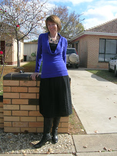 I used a knit I bought at Brunswick Fabrics on our first Pattern Review Down Under weekend a couple of years ago. I bought quite a few metres and I have some left over for a matching skirt. The fabric has two layers. The under layer is very sheer - you can see my hand under it. The top layer is partially stitched to the bottom layer and is raw edged. I am not sure what the fibre content is but it feels like it has some cotton in it.